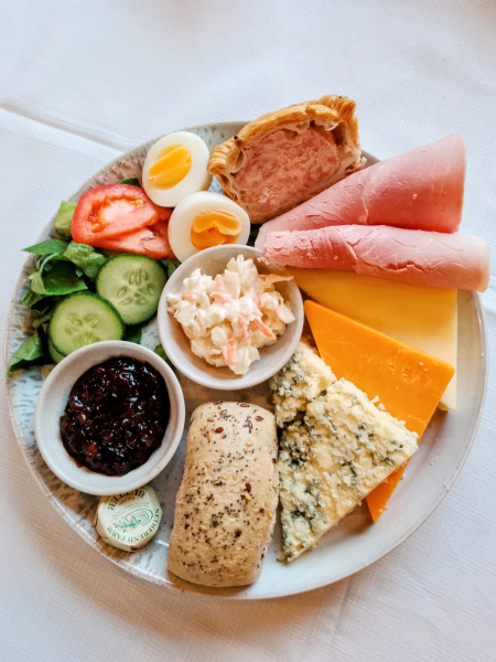 Traditional and Vegetarian Platters available featuring Farmhouse Mature Cheddar, Blue Stilton, Red Leicester, Honey Roast Ham, Pork Pie (or Fiesta Three Cheese Quiche for Vegetarian), Apple, Seedless Grapes, Summer Salad, Local Onion Chutney, Warm Rustic Baguette